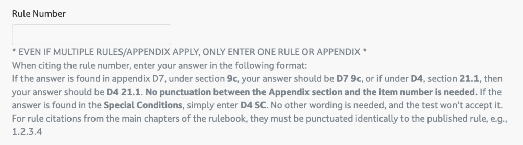 One of the issues with citing rules is they must be precisely noted. That’s why under each question is an explanation of how to cite rules and appendices. The method isn’t the same, and extra punctuation or other notes will cause the rule to be marked wrong, even if the numbers are correct. Here’s an example of the text below each and every rule citation box on the exam: