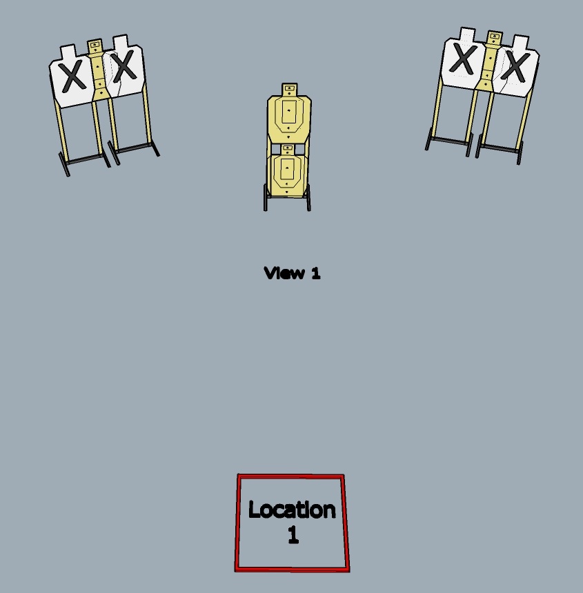 Think of a position as a spot where a competitor stops to engage targets and a view are the targets seen from that position. Here is a very simple example of a single position with one view. We have a single location with a view of 4 scoring targets. This would be a legal short course because it doesn’t require more than 8 scoring hits from a single location or view (best 2 hits per target will score). If the best 3 hits per target were scored, then this stage would not be legal because it would require 12 hits from a single location and view. But could we make this stage legal? Yes!