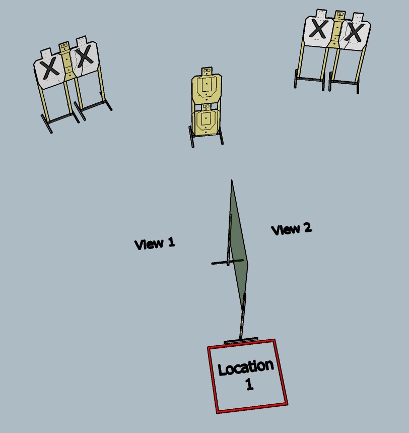 It isn’t the most exciting stage, but it is legal. The stacked targets in the center are available from both view 1 and view 2. Yes, a competitor can choose to shoot 3 targets (9 shots) from one side of the wall but is not required to take all 9 shots from one view because those center targets are also available in the other view. It’s called freestyle and this allows for all the divisions to come up with suitable stage plans for their magazine capacity. This is a boring stage design. But it is a good stage to explain the concept of location and view.